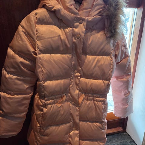 Dunjakke til jente i str 14 selges. Norheim bymarka. Mørk rosa farge med hint av lila.