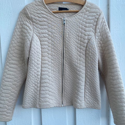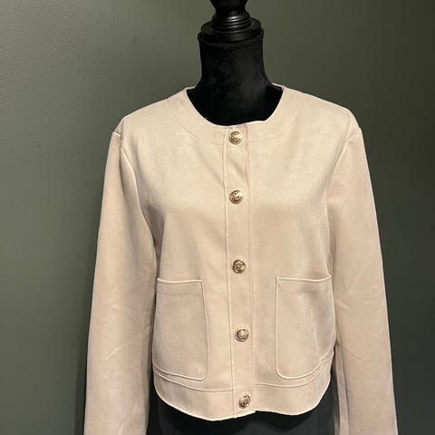 Shein cardigan i beige farge, laget av polyester. Størrelse S, designet for kvinner. Cardiganen har lange ermer og dekorative svarte kanter rundt hals, lommer og ermekanter.