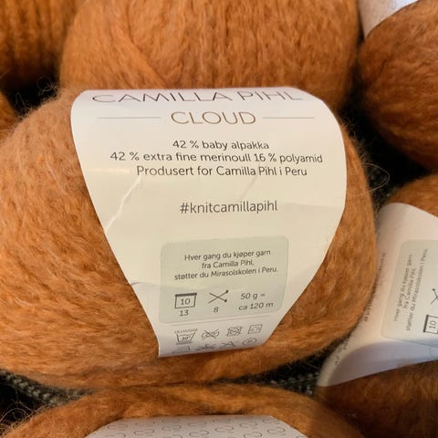 Camilla Pihl Fnugg garn . Hver nøste veier 50 gram og har en lengde på ca. 80 meter. Garnet anbefales til pinner størrelse 7-8 mm og er laget av 100% børstet alpakka