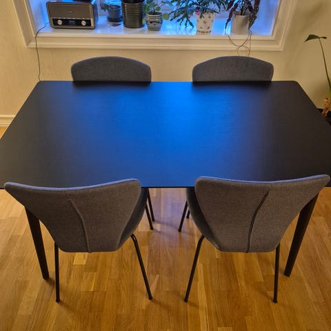 Bordet er stabilt og fint, en bitteliten skade helt ytterst på bordet som nesten ikke vises (se bilder). ingen riper i bordet. Understell i svartmalt MDF + base i MDF med svartlakkert metallplate.