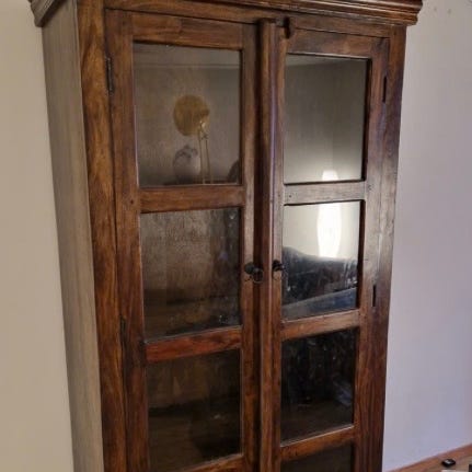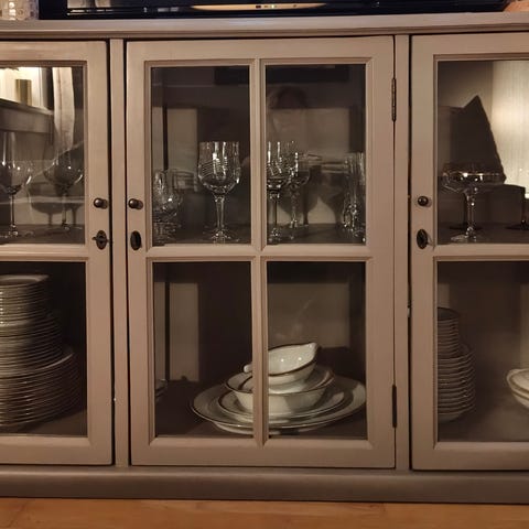 Selger et Regissør vitrineskap fra IKEA pga flytting. Det er en eldre modell som ikke går an å få tak lengre. Skapet har fått seg en del skrammer oppigjennom som nok enkelt kan skjules ved maling. Totalt 6 hyllerrader hvorav 4 er av glass