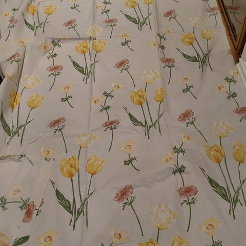 Hvit lettstelt duk med vevd mønster. Strykefri hvis den kjøres i tørketrommel i 5 min. Str 180 x 140 cm. Fremstår som ny. Sendes mot porto.