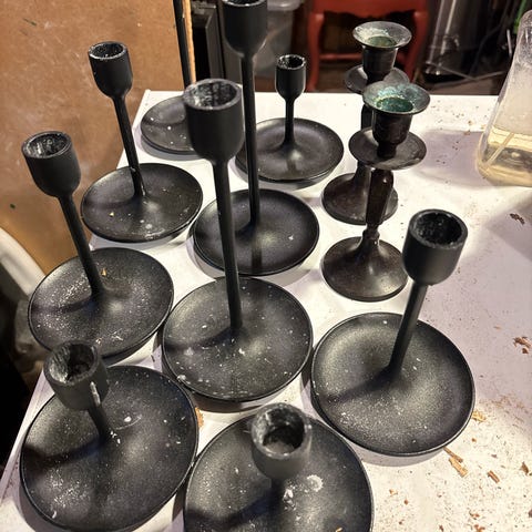 Selger to lysestaker fra Ikea. De er pent brukt, men som bilde viser, er det ene lokket løst. Noen bruksriper på toppen hvor lysene har stått. 2 merker på den største lysestaken