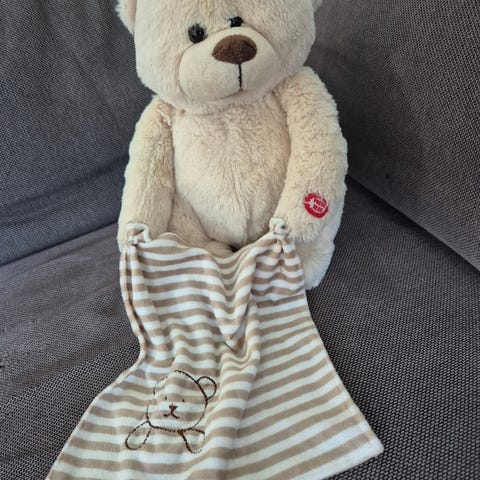 Teddykompaniet bamse med koseklut. Bamsen er lys i fargen og kommer sammen med en stripete koseklut med brodert bamsemotiv. Snakkende bamse. "Vil du leke med meg". Veldig morsom leke