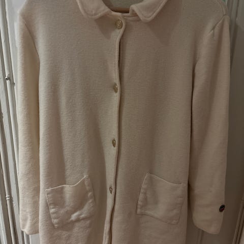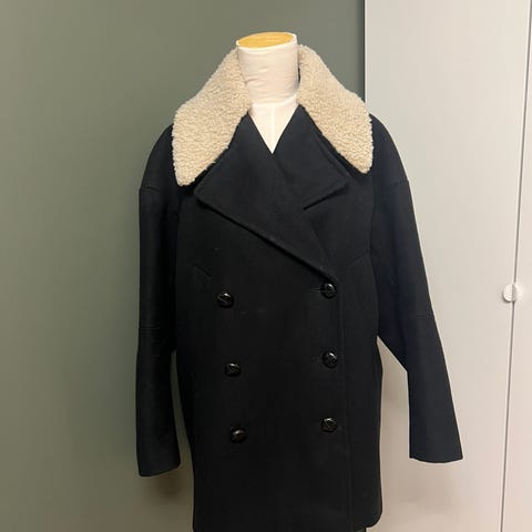 Filippa K Annet yttertøy i størrelse L, laget av ull. Jakken har en grå farge og inkluderer belte i livet for justering.