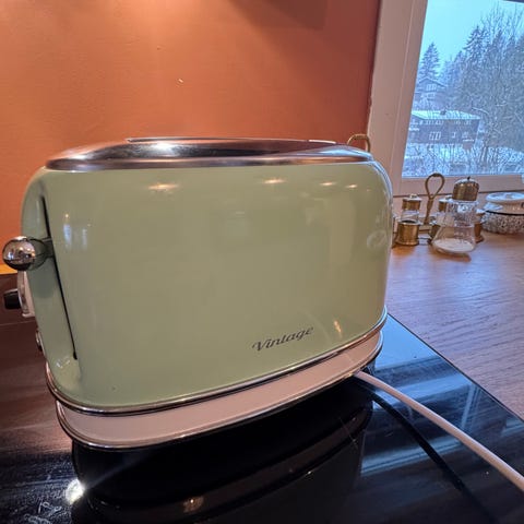 Selger min fine lyseblå brødrister fra merket Ariete. Den har plass til to skiver, seks nivåer for innstilling av ristingsgrad og avtagbar smulesamler. Rustfritt stål.