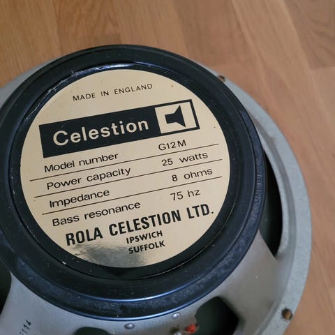 Celestion 870 8 Ohm 70 W 12". This is a Celestion V-Type made for Tone King. According to the web it has been 'slightly tweaked'. I don't hear the difference, you might. Not broken in.