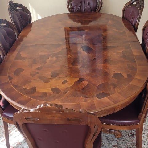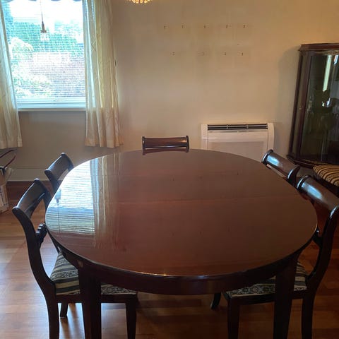 Antikk Gustaviansk spisebord med 2 ileggsplater a 48 cm , og 4 stk stoler .