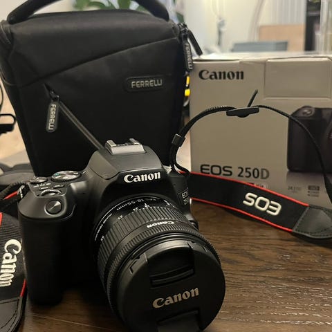Selger mitt Canon EOS 250D speilreflekskamera med tre objektiver:
