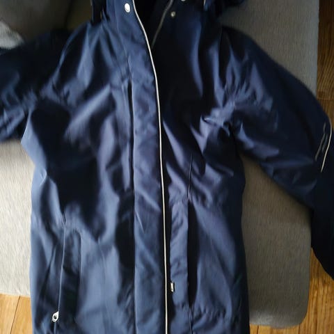 God regnjakke med for selges da den har blitt for liten. Praktisk med lommer og knapper bak. Glidelås og knapper foran. Veldig praktisk. Brukt av slank jente/tenåring fra 160 til 170. Str 34