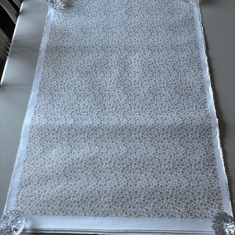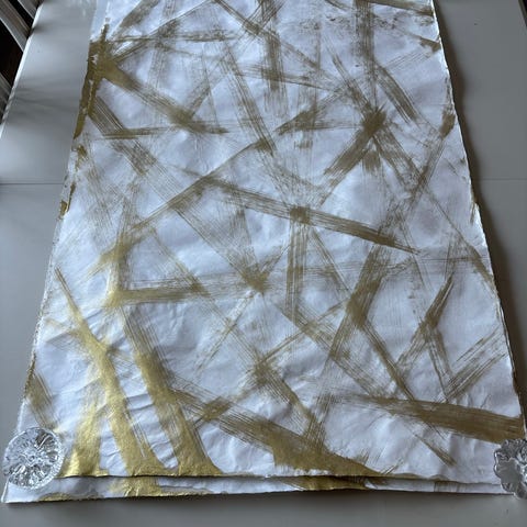 Papiret er relativt tykt og solid, med tydelig struktur fra bretting og produksjon, noe som er vanlig for større, håndlagde washi-ark. Dette gir et autentisk japansk håndverkspreg og gjør arkene godt egnet til videre bruk eller samling.