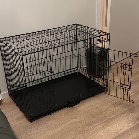 Zoozaker hundebur i blått metall med dør og avtakbar bunnplate. Buret er egnet for oppbevaring eller transport av hunder, og gir et trygt og lukket område. Designet for praktisk bruk med låsemekanisme på døren.