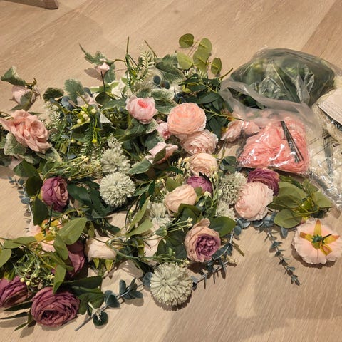 - Tolv små dekorasjonsblomster (tørket). Fine å ha f.eks. for å pynte servietter, bordkort eller invitasjoner (bilde 9 og 10) - 70 kr.