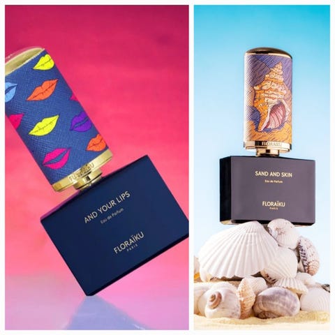Selger dekanter/parfymeprøver av fem parfymer fra Floraïku: One Umbrella for two, Sand and Skin, AO, And your Lips an Gong.