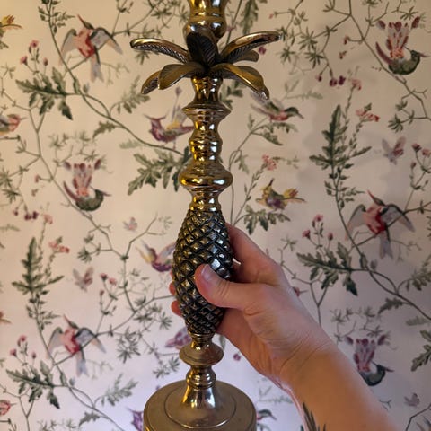 Selge2 2 Stk Helt Nye Palme Lysestaker i Gill . HØYDE 24 Cm . Kr 199 Pr stk . Eller kr 378 for begge to . ( jeg betalte a' kr 299,90 prstk . Kr 600 for begge to ) Utrolig lekre ,men dem ble alt for store og ruvende på mitt bord .