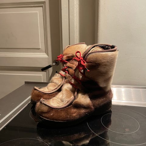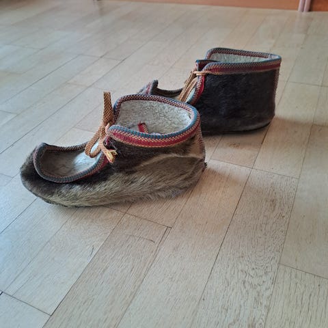 Vintage sko i selskinn. Står ikke str. i de. Virker som str. 38/39. Fine på hytte. Foret med saueskinn. Myke og varme.
