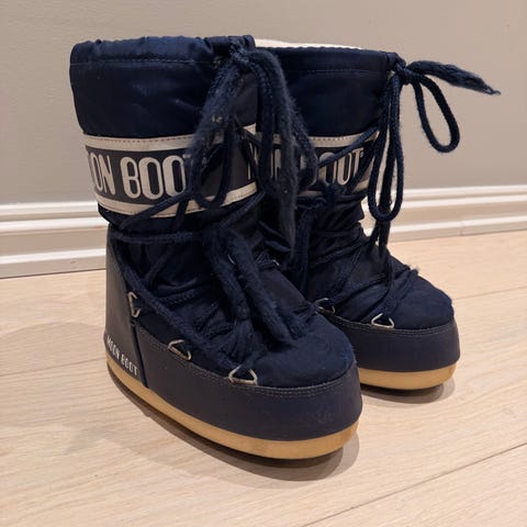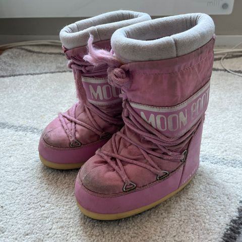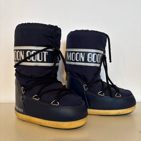 Brukte moon boots i str 27-30. sålen er hel og fin, og ingen slitasje foruten om at de er litt skitne og at jeg har reparert festet til den ene metallringen som snøringen går gjennom. Fiks ferdig eller så kan de hentes på Skøyen eller Ulvøya.
