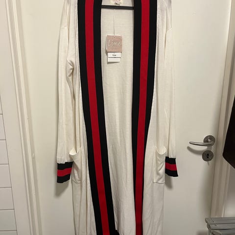 Klaffer på skuldrene og lommer på brystet. Belte i livet. Knapper til lårhøyde.
