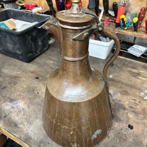 Kobber kannen har vært brukt til pynt. Høyde 28 cm, diameter 20 cm. Hentes på Sotra.