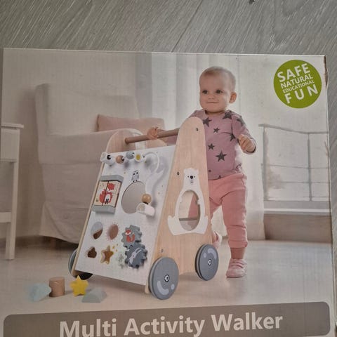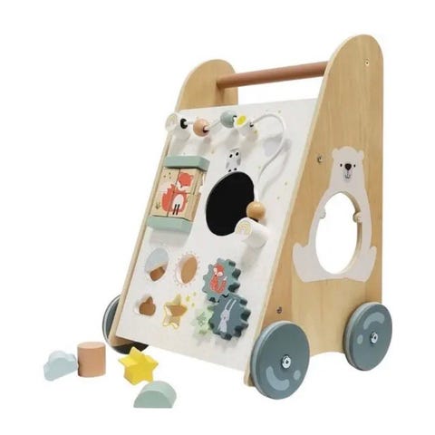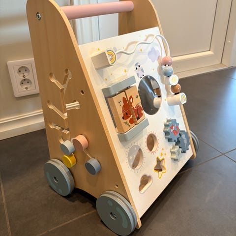 Denne solide vognen er laget av tre og har hjul, håndtak og flere spennende aktiviteter som holder små hender og hoder opptatt.