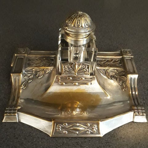 Blekkhus med holder laget av metall og glass. Holderen har plass til to blekkhus og en penn, med dekorative detaljer i metall. Passer til skrivebord og kontorbruk. den er antakelig fra 1920-30 åra