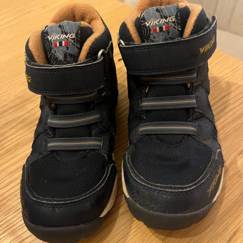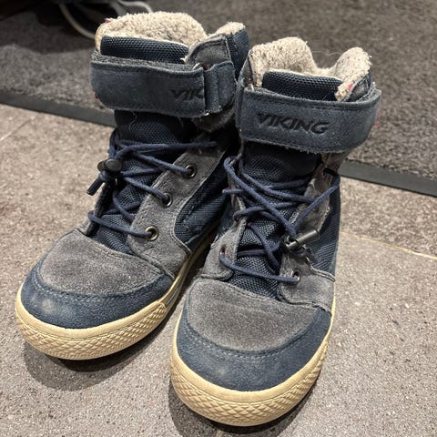 Viking barnesko for gutt i størrelse 30. Skoene er blå og har borrelås og snøring for justering. De er foret med varmt materiale for økt komfort og beskyttelse mot kulde.