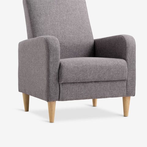 «Stofftrekk. Sete- og ryggputer i skum. Ben i massivt tre. B69 x H90 x D76 cm»