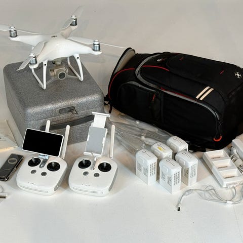 DJI Phantom 4 Pro drone med fjernkontroll, inkludert tre ekstra batterier og tilbehør for lagring og transport. Dronen har innebygd kamera og skjerm på fjernkontrollen. Lader til kontrollen/dronen medfølger samt filter og bæresele.