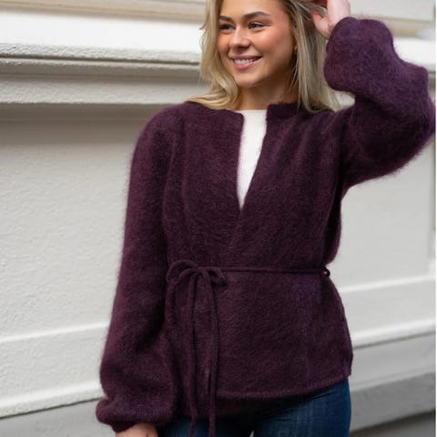 ella&il Cardigan i mohairull for kvinner i størrelse M. Cardiganen er svart og laget av mohairull, med belte i midjen for justering.