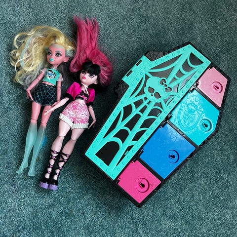 Monster High dukke med langt rosa og svart hår. Dukken har klær i rosa og svart med detaljer. Passer som samleobjekt eller til lek. Selges den som er til venstre. Kan sendes fra 20.01
