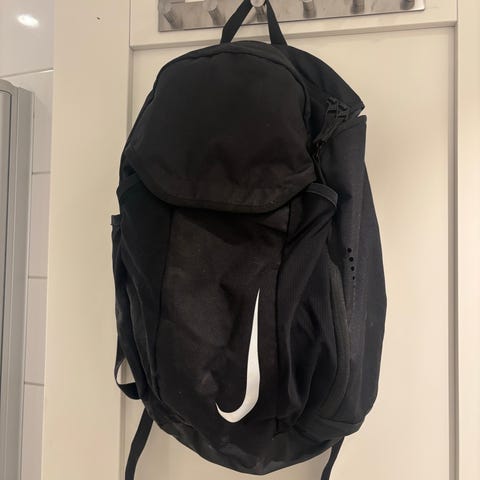 Nike ryggsekk med blått og svart mønster. Har flere rom med glidelås, polstrede skulderstropper og sidelommer i mesh. Egnet for daglig bruk og bæring av personlige eiendeler. Kjøp på ferietur I china.