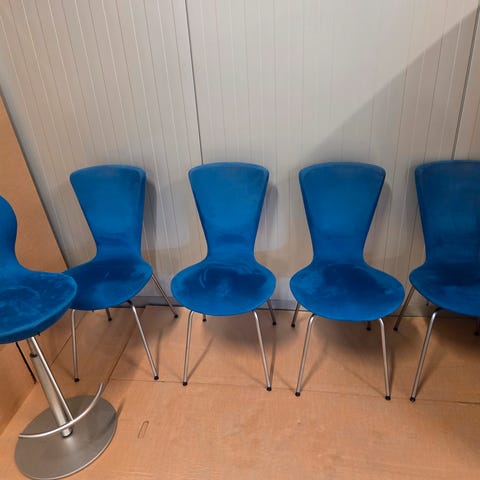Pent brukte barstoler av hvit skinn
