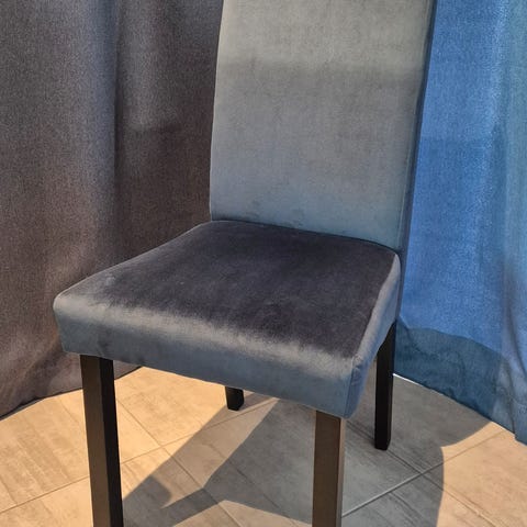 Blå velour spisestoler fra søstrene grene. Sorte ben. 6 stykker selges helst samlet. Må hentes. Noen merker på et par av stolene. Se bilde. Mulig dette kan vaskes bort med en god såpe 😊💪🏼🤞🏼