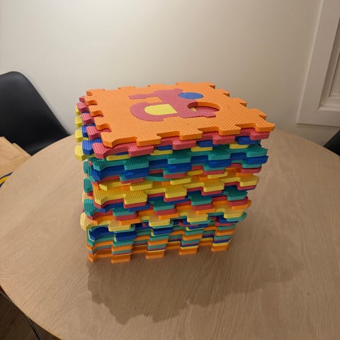 Matten er satt sammen av firkanter som gjør det lett å pusle sammen matten slik man ønsker det. Man kan også pusle sammen lekekasse eller hva med et lite hus? Butikk? Mulighetene er mange.