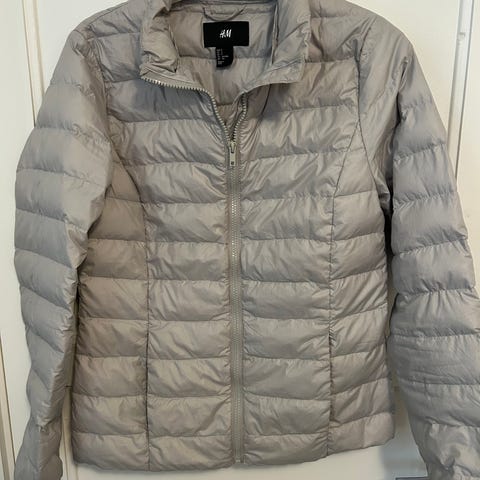 Fin dunjakke i størrelse S for dame. Jakken er hvit og laget av dun, noe som gir varme og isolasjon. Passer til bruk i kaldere vær. Er brukt som mellomlagssjakke.
