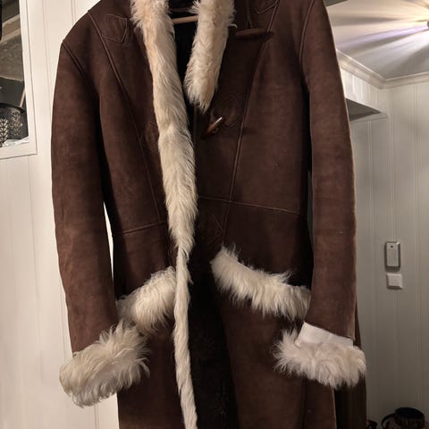 Sjekker interessen for denne unike ullkåpen i saueskinn/lammeskinn. I svært god stand. Vil si den er str 38/40. Modellen på bildet er 167cm.
