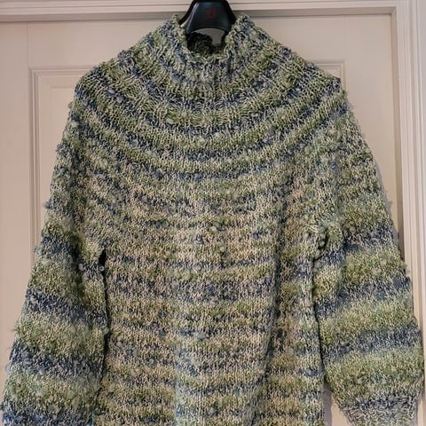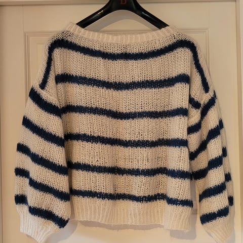 Hjemmestrikket genser med tilhørende lue, helt ny. Passer til både dame og mann. Vil si den er en str L til jente.