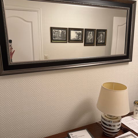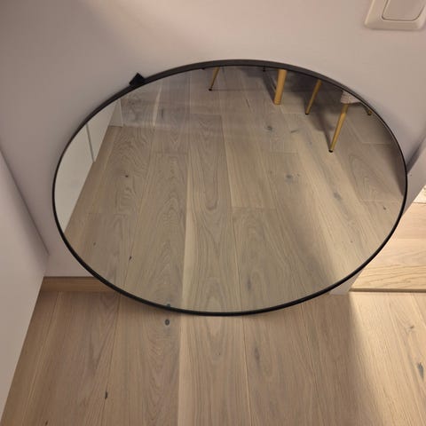 Elegant speil som kan henges på vegg eller stå på en kommode inntil veggen. Kun brukt på visning. Selges pga flytting.