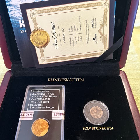 Samling av historiske mynter fra Rundeskatten, hvorav en pen gulldukat. Ellers i ulike størrelser og tilstander, inkludert et opprinnelsesbevis. Mynter viser varierende grader av slitasje og patina, og oppbevares i en grønn displayeske med kartmotiv. Passer for samlere og historieinteresserte.