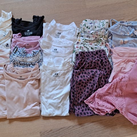 Kjoler/bukser/jumpsuit/t-skjorter/shorts og Fila slippers str 33. Alt helt og pent. Det meste fra H&M en kjole fra Noa Noa