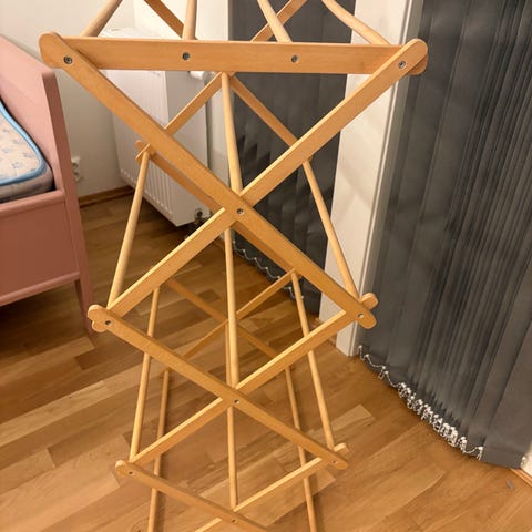 Tørkestativ i metall med hvit farge. Designet for tørking av klær og tekstiler. Stativet har en sammenleggbar konstruksjon for enkel oppbevaring og transport.