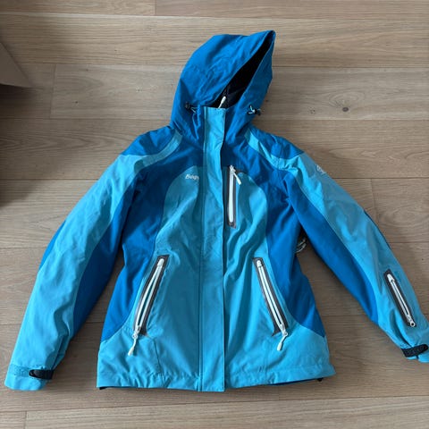McKinley ytterjakke i størrelse S for kvinner. Jakken er blå og laget av vannavstøtende stoff. Den har hette og glidelås, samt lommer og justerbare detaljer.