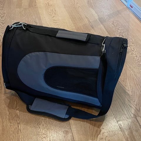 Transportveske for kjæledyr i svart og grå farge.