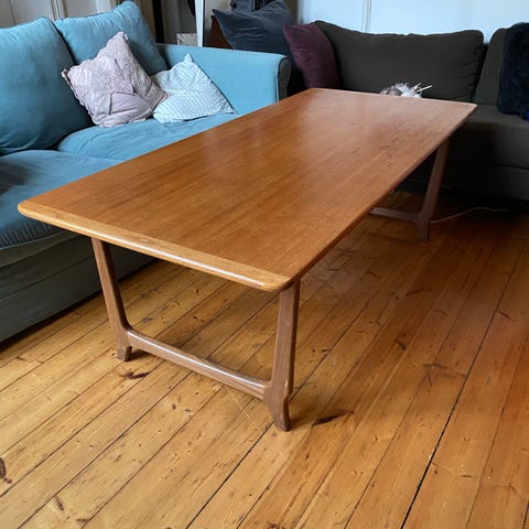 Solid og stødig salongbord i teak. Dessverre fått noen riper i bordplata ellers pent og i orden.