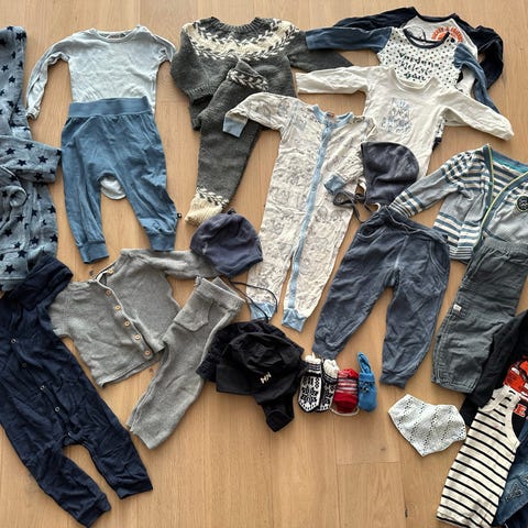 Newbie, Reflex ull sett, H&M+ div baby barneklær for gutt i størrelse 80 til 90 (86) 1-2 år. Inneholder plagg i ulike materialer, inkludert 1 bukse i bomull og ullblanding, egnet for barn i denne alderen.