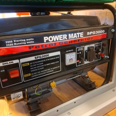 Bebe Powerman 5600SH bensingenerator med ramme for transport og beskyttelse. Generatoren er utstyrt med en Honda motor. Den gir elektrisk strøm via to uttak, egnet for bruk i områder uten tilgang til strøm eller som backup-løsning.