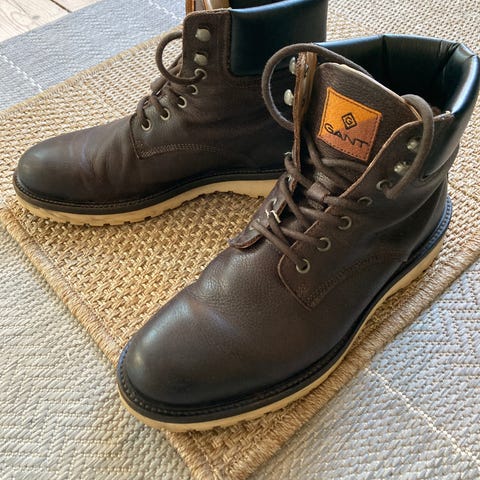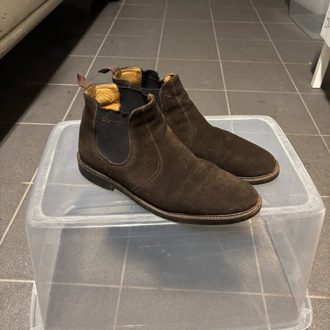 Jeg selger mine elskede GANT Chukka-støvler billig. Skoene er brukte, men i god stand. De har blitt godt vedlikeholdt og er rene og luktfrie. Overdelen er i svart semsket skinn, og størrelsen er 42 EU.