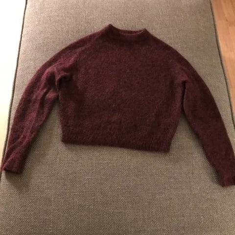 Grøngråblå varm og deilig tovet mohair og ullblanding. Brukt to ganger. Elsker den, men akkurat for liten.