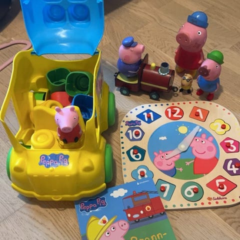 Interaktiv Peppa Gris med tilhørende 10 mynter som puttes inn i sprekken og Peppa stilles inn på om hun teller mynter eller sier fargen på mynten. Det er også knapper foran å trykke på for å få Peppa til å synge. Bruker to AAA batterier. Fungerer som den skal.