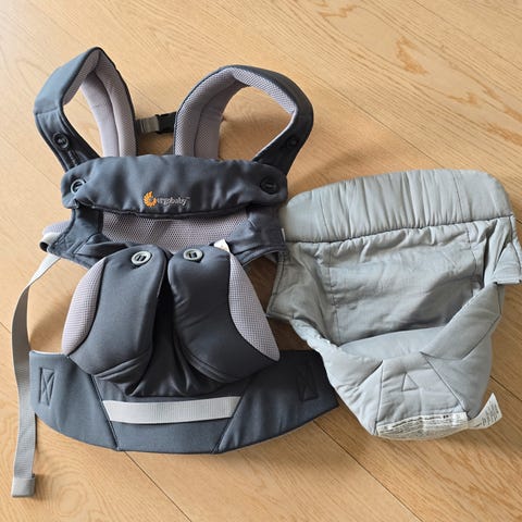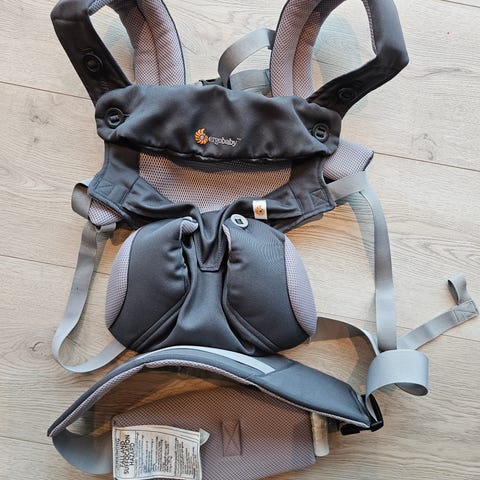 Ergobaby four position 360 cool air selges med nyfødt innlegg. God bæresele som kan brukes fra barnet er nyfødt og opptil 20 kg! Pent brukt. Nyvasket og klar for nye eventyr.